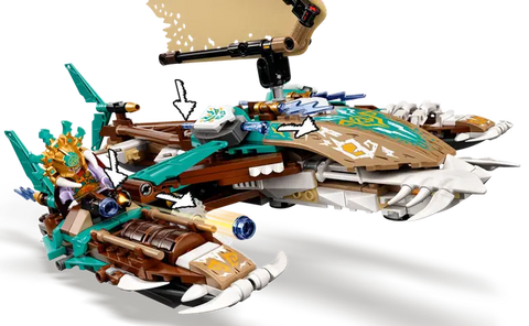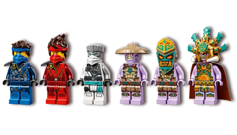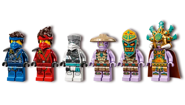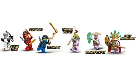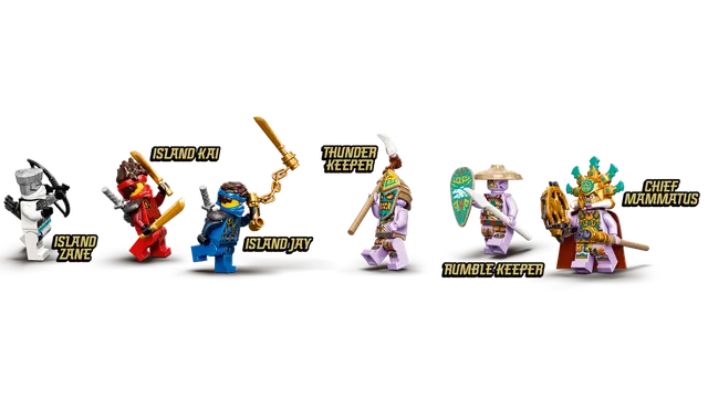 Dieses Ninja-Spielset enthält 6 Minifiguren: Island Jay, Island Kai und Island Zane sowie ihre Widersacher Chief Mammatus, den Hüter des Donners und den Hüter des Grolls. Für actionreiche Duelle sind alle Minifiguren mit Speeren, Schwertern und Schilden ausgerüstet.