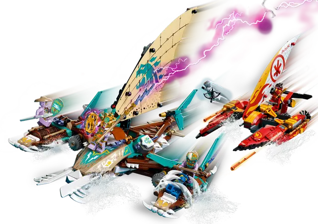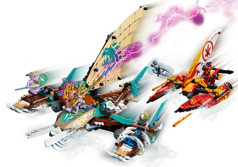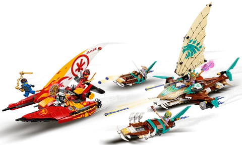 LEGO® NINJAGO® Duell der Katamarane (71748): Dieses actionreiche Ninja-Spielset beinhaltet 2 Katamarane für spannende Duelle auf hoher See. Einer der Katamarane lässt sich in 3 Boote zerteilen.Beinhaltet 6 Minifiguren aus der NINJAGO® TV-Serie: Island Jay, Island Zane und Island Kai bekommen es mit Chief Mammatus, dem Hüter des Grolls und dem Hüter des Donners zu tun. Alle Figuren tragen coole Ausrüstung.Der Katamaran der Hüter ist mit 2 Shootern ausgestattet und lässt sich in 3 separate Boote zerteilen. Auf einem dieser Boote befindet sich ein Gefängnis für die Ninja. Ein anderes Boot verfügt über 2 Shooter und eine Schatulle mit Diamanten.Der Katamaran der Ninja ist mit 2 Shootern ausgestattet und lässt sich für schnelle Fahrten zusammenklappen oder für Angriffe ausklappen.Das 780-teilige Action-Set bietet Kindern ab 9 Jahren eine anspruchsvolle Bauaufgabe. Dieses tolle Geburtstags- oder Weihnachtsgeschenk lässt die Freunde junger Ninja-Fans staunen.Der Katamaran der Hüter ist 22 cm groß, 33 cm lang und 24 cm breit. Zwischen den actionreichen Duellen bereichert er als spektakulärer Blickfang jedes Kinderzimmer.Freue dich auf weitere NINJAGO® Sets zur TV-Serie wie Lloyds Dschungel-Bike (71745), den Dschungeldrachen (71746) und das Duell der Katamarane (71747).Die LEGO® NINJAGO® Themenwelt bietet Ninja-Fans coole Spielsets. Bei spannenden Abenteuern mit ihren Ninja-Helden entwickeln sie lebenswichtige Fähigkeiten.LEGO® Steine werden seit mehr als 60 Jahren aus Materialien höchster Güte gefertigt, damit sie sich jedes Mal fest zusammenstecken und wieder leicht trennen lassen – ohne Ninja-Fähigkeiten zu benötigen!LEGO® Steine entsprechen strengen Sicherheitsstandards, um Kinder sicher spielen zu lassen.
