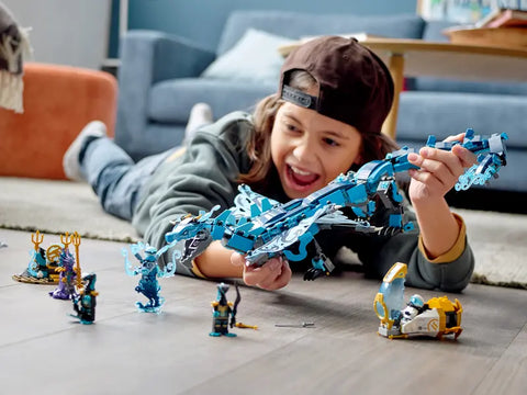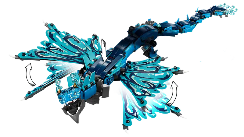 Der äußerst detailreiche Wasserdrache (71754) lässt Kinder fantastische Geschichten aus der "TV-Serie NINJAGO®: Geheimnis der Tiefe" nachstellen. Der Drache kann Kopf, Maul, Beine und Flügel bewegen – und seinen Schwanz wie eine Peitsche schlagen lassen. Kinder sind mit diesem tollen Spielset viele Stunden beschäftigt.