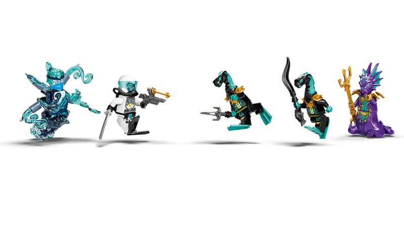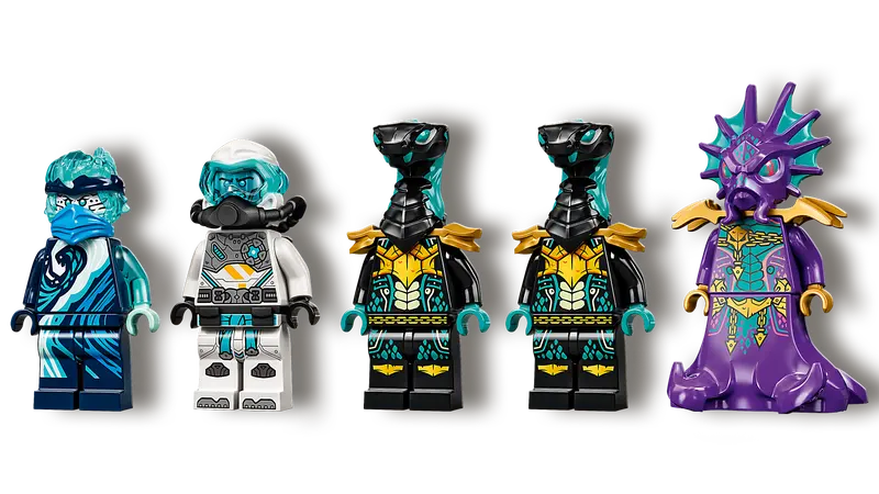 Für packende Duelle um das begehrte Wellenamulett beinhaltet das Drachen-Spielset 5 Minifiguren: NRG Nya, Unterwasser-Zane mit Taucherflossen, Prinz Kalmaar und 2 gefährliche Maaray-Wächter. Ein Mini-U-Boot mit Cockpit für Unterwasser-Zane und ein Ständer fürs Amulett sind ebenfalls enthalten.