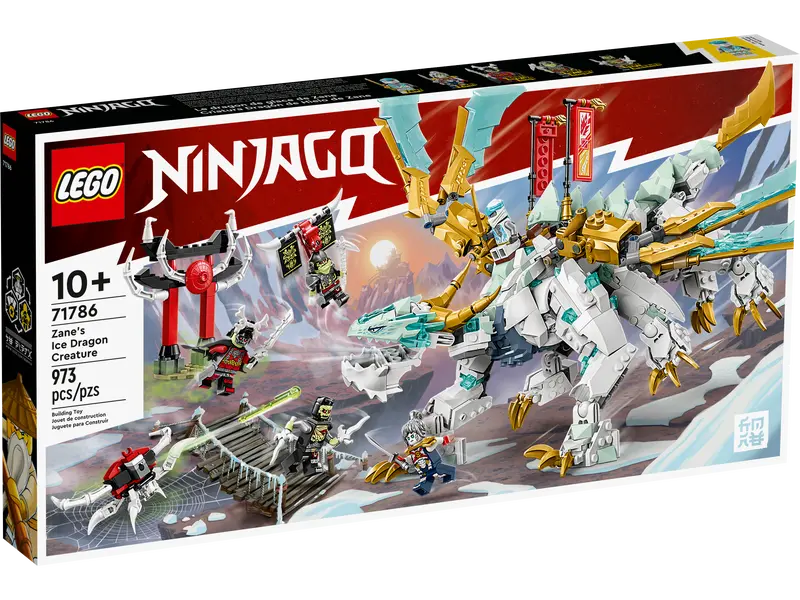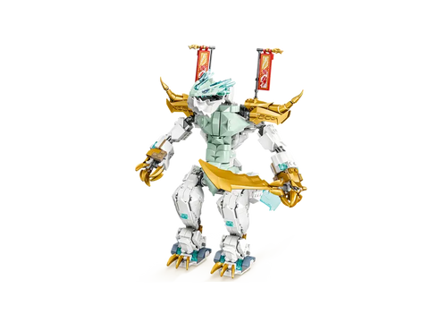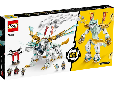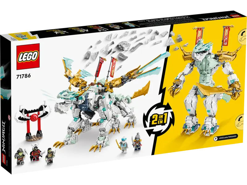 LEGO® NINJAGO® Zanes Eisdrache (71786) ist ein Spielset mit allem, was Kinder ab 10 Jahren für spannende Rollenspiele mit ihren Ninja-Helden brauchen. Dieses NINJAGO 2-in-1-Modell kann einen beweglichen Eisdrachen mit 6 Beinen, langem Schwanz, Hörnern und Flügeln mit goldenen Klingen darstellen oder in einen beweglichen 2-beinigen Drachenkrieger umgebaut werden, der eine große goldene Klinge hält.