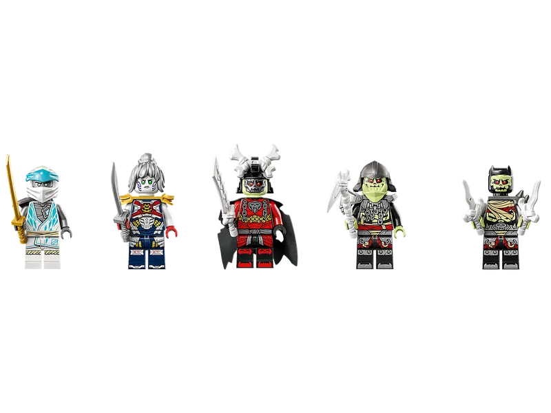 - 5 Minifiguren: Zane und Pixal schwingen Schwerter, um es mit dem Skelett-Ritter, dem Skelett-Krieger und dem Skelett-König aufzunehmen. Die 3 Bösewichte haben eigene Waffen aus der Ausrüstung des grünen Skelett-Kriegers und versammeln sich gern in ihrem Tempel