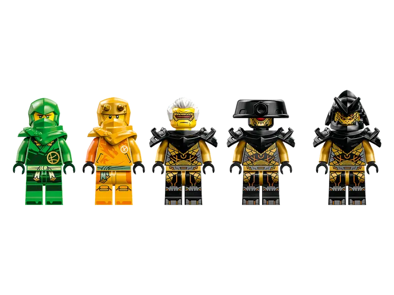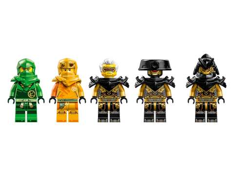 Dieses Mech-Spielset beinhaltet 5 Minifiguren. Der Ninja-Meister Lloyd trägt 2 Katanas, sein Ninja-Schüler Arin hat neben 2 Katanas auch noch einen Enterhaken. Gemeinsam müssen sie es mit 3 Bösewichten aufnehmen, das heißt mit Rapton, der ein kaiserliches Schwert schwingt, mit dem Kaiserlichen Wachkommandanten, der einen Stab hat, sowie mit dem Kaiserlichen Klauengeneral, der ebenfalls ein kaiserliches Schwert trägt. In diesem Set ist alles vorhanden, was Kinder für unzählige Rollenspiele und packende Duelle brauchen.