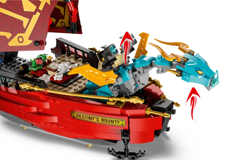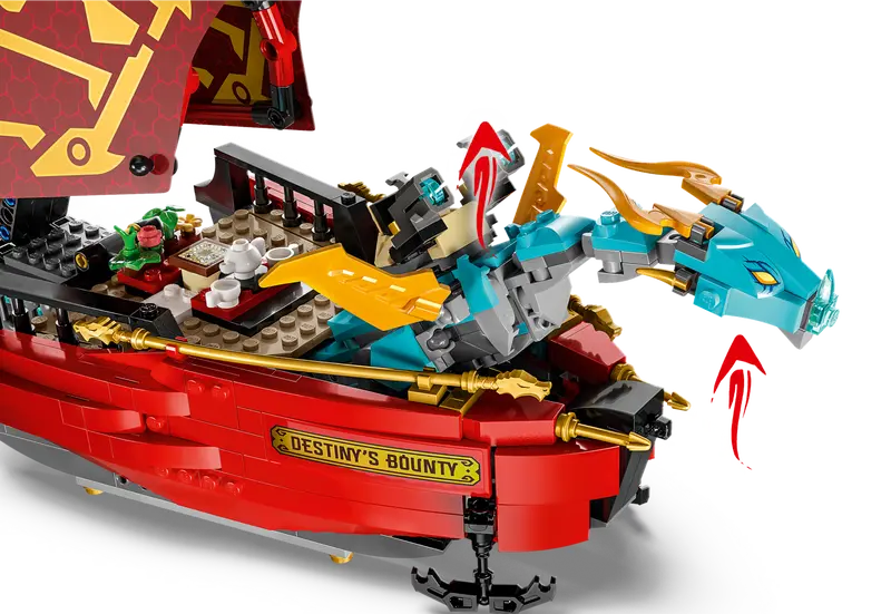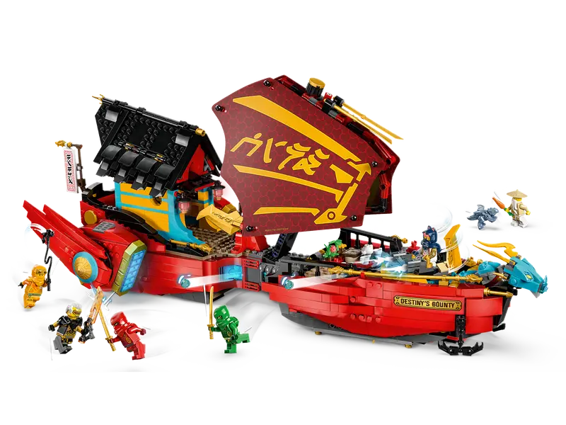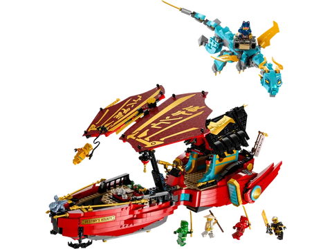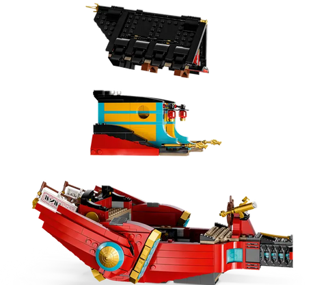 Der Ninja-Flugsegler im Wettlauf mit der Zeit (71797) ist genau das richtige Spielset, um Ninja-Fans ab 9 Jahren spannende Actionszenen mit dem modernisierten Luftschiff darstellen zu lassen. Der legendäre Flugsegler ist jetzt ein Luftschiff, mit dem die Ninja über die neu verschmolzene Welt schweben. An Bord befindet sich ein Drache, der im Bug nistet. Außerdem verfügt das Luftschiff über bewegliche Segel, Shooter am Heck und um 360 Grad drehbare Triebwerke. Das Dach kann man abnehmen, um den Navigationsraum und das Spielzimmer mit einem Spielautomaten preiszugeben.