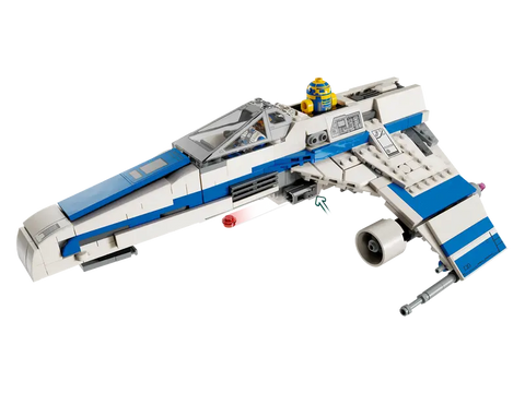 - New Republic E-Wing: Der Sternjäger verfügt über ein aufklappbares LEGO® Minifiguren-Cockpit, ein Fach für eine Blaster-Pistole unter dem Sitz, einen Platz für den Droiden hinter dem Cockpit, 2 Shooter und ein einziehbares Fahrwerk