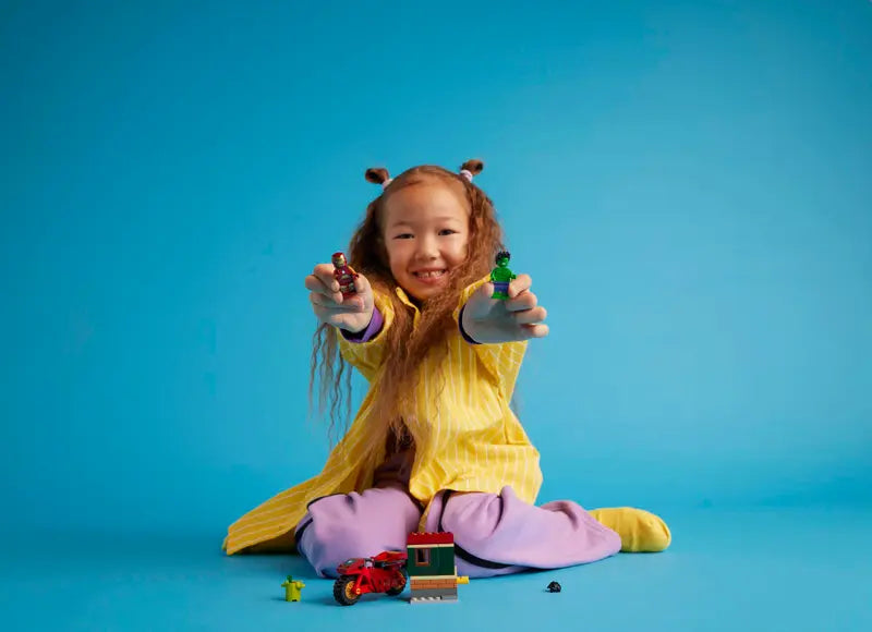 Dieses LEGO Marvel Spielset beinhaltet die Minifiguren Iron Man und den Hulk sowie Iron Mans Schiebemotorrad und ein baubares Haus. Kinder können das Bike bauen, eine Funktion aktivieren, um das Gebäude einstürzen zu lassen (das passiert häufiger, wenn der Hulk auftaucht), und das Haus neu errichten, damit der Hulk wieder etwas „zu tun“ hat. Ein vorgefertigter Fahrzeugrahmen dient als Starter-Bauelement und erleichtert Kindern das Bauen. Eine intuitive Bauanleitung in Form einer farbenfrohen Bildergeschichte liegt bei. Zusätzlichen digitalen Bauspaß bietet die intuitive LEGO Builder App, in der junge Baumeister Modellansichten vergrößern und drehen können.