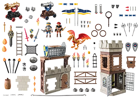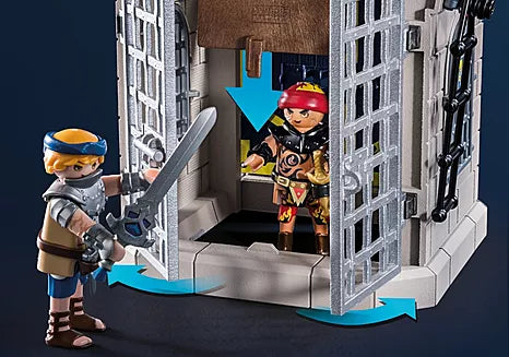 Die Turnierarena ist vollgepackt mit spannenden Funktionen und Zubehörteilen. Die PLAYMOBIL-Figuren Arwynn und Dash liefern sich ein packendes Duell, bei dem sie ihre Kanonenkugeln durch Zielringe schießen müssen, um Punkte zu sammeln. Der Turm ist mit einem Durchbruch und einer Falltür ausgestattet, die durch das Treffen der Zielscheiben ausgelöst werden können. Außerdem gibt es ein Gefängnis im unteren Teil des Turms und einen Käfig über dem Wehrgang, der das Wächter-Schwert beherbergt.