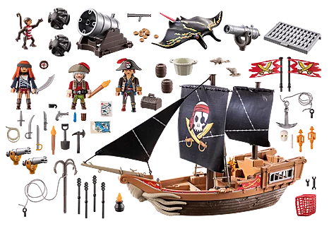 Piratenfans aufgepasst! Das große PLAYMOBIL Piratenschiff (Artikelnummer: 71530) bietet spannende Seeräuberabenteuer. Mit dreh- und schwenkbaren Kanonen, einer funktionsfähigen Ankerkanone und einem integrierten Auftriebskörper ist es perfekt ausgestattet. Der schwimmfähige Rumpf und die praktischen Fußklemmungen sorgen für sicheres Spielen. Bekämpfe Seemonster und feindliche Piraten mit diesem beeindruckenden PLAYMOBIL Segelschiff!